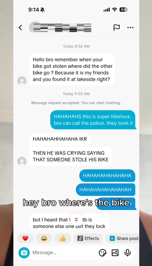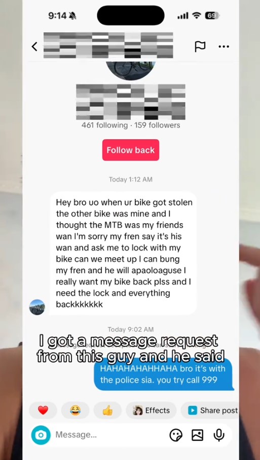 He cited comments on his original video from users who claimed that the grey bike belonged to his friend.