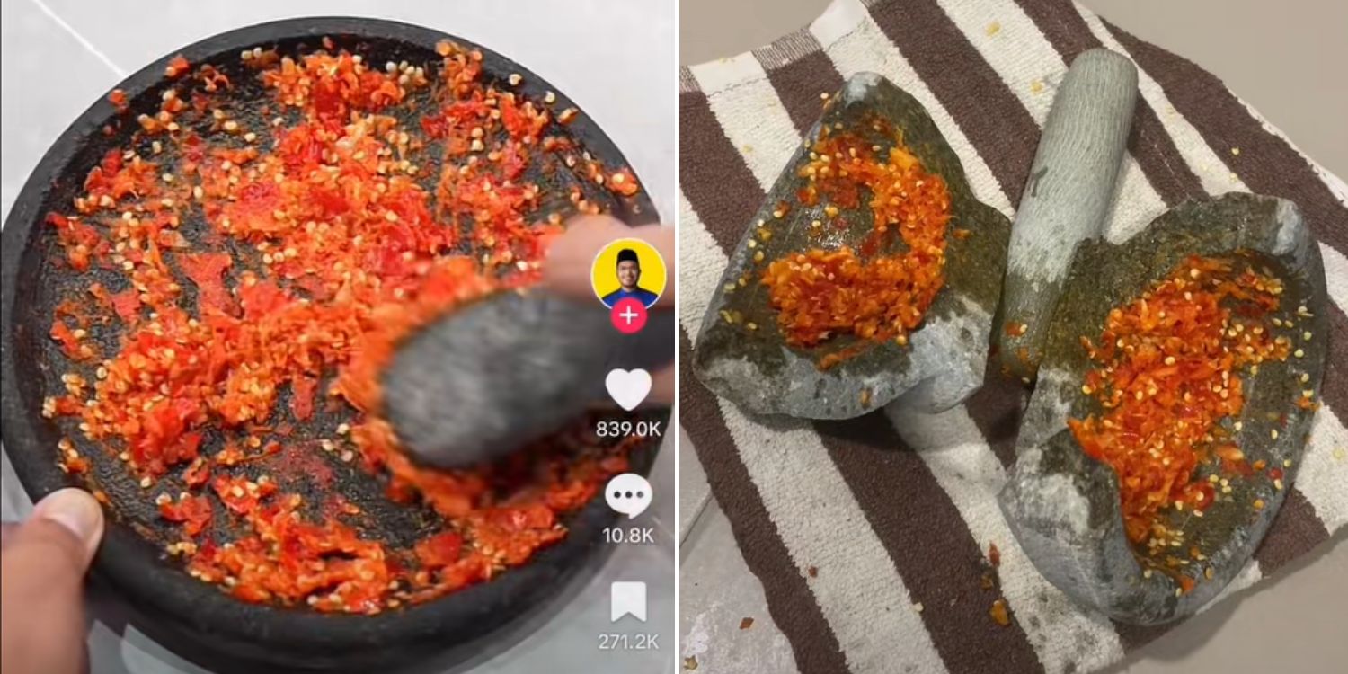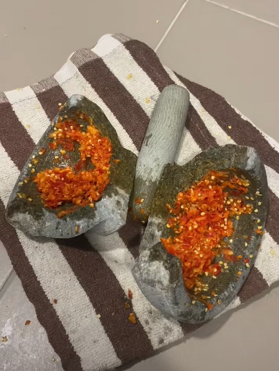 In Malaysia, a woman unintentionally broke a stone mortar in half while making ayam gepuk — fried chicken crushed in chilli paste — using a recipe from entrepreneur and popular food content creator Khairul Aming.