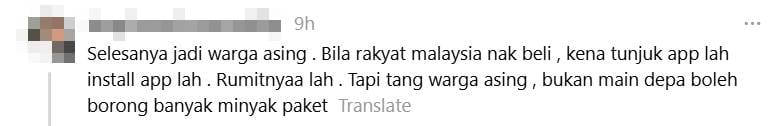 Translation: The comfort of being a foreigner. When Malaysian people want to buy, have to show app and install app. It’s complicated. But foreigners, they can wholesale a lot of oil packets.