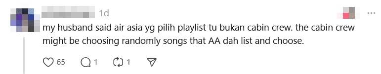 Another netizen claimed that her husband said AirAsia chooses the song it plays on its flights and that the cabin crew may have just picked the song from their approved list.