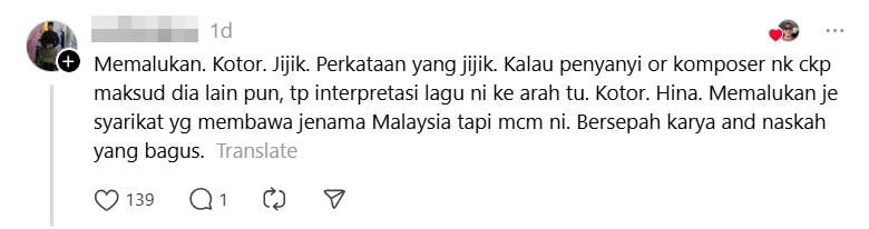 Translation: Shameful. Dirty. Disgusting. Disgusting words. If the singer or composer wanted to say something different, they would have meant something else, but the interpretation of this song is that way. Dirty. Disgraceful. It’s just a shame for a company that carries the Malaysian brand, but it is like this. A mess of good work and scripts.