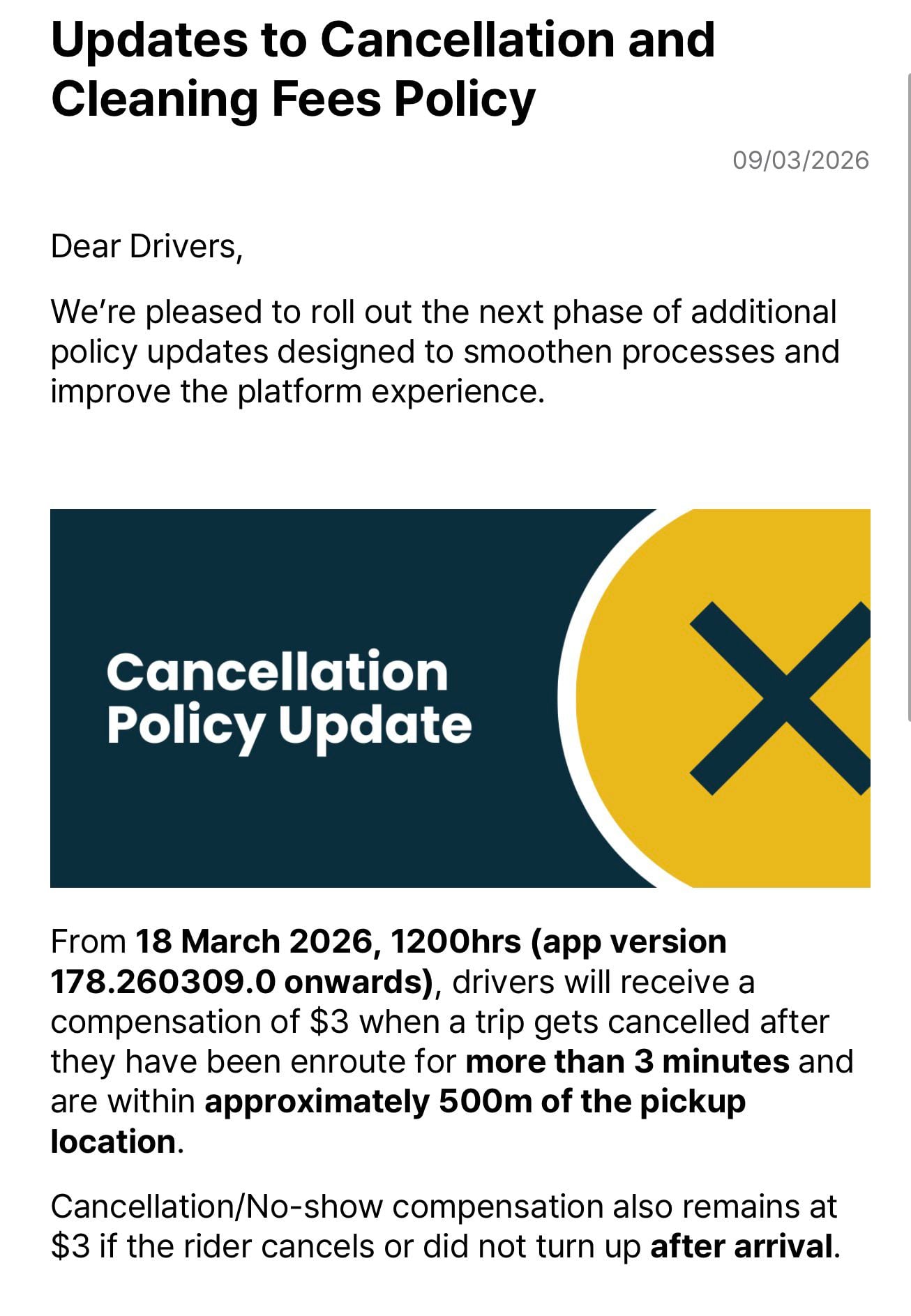 Under the updated policy, drivers will receive S$3 compensation if they have been travelling towards the pickup location for at least three minutes and are within 500m of the rider when the trip is cancelled.