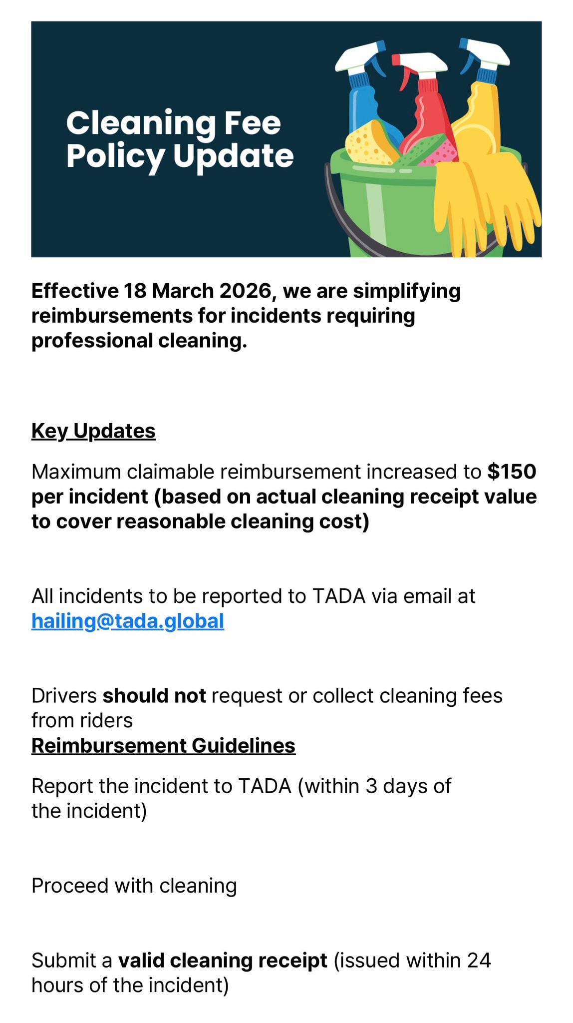 NPHVA also shared that TADA will be increasing the compensation cap for cleaning fees to S$150.