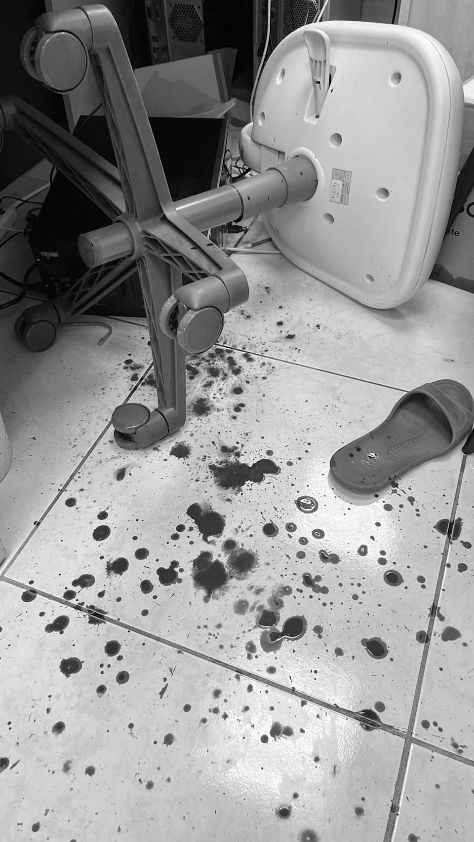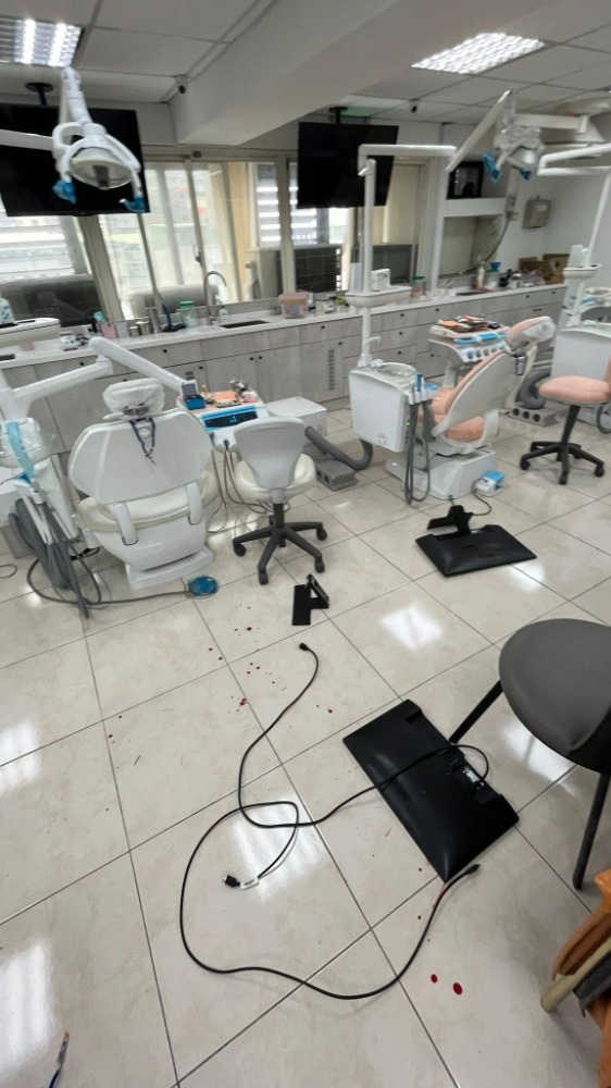 Monitors were knocked over in the chaos, and photos showed blood spattered on clinic documents and the floor.