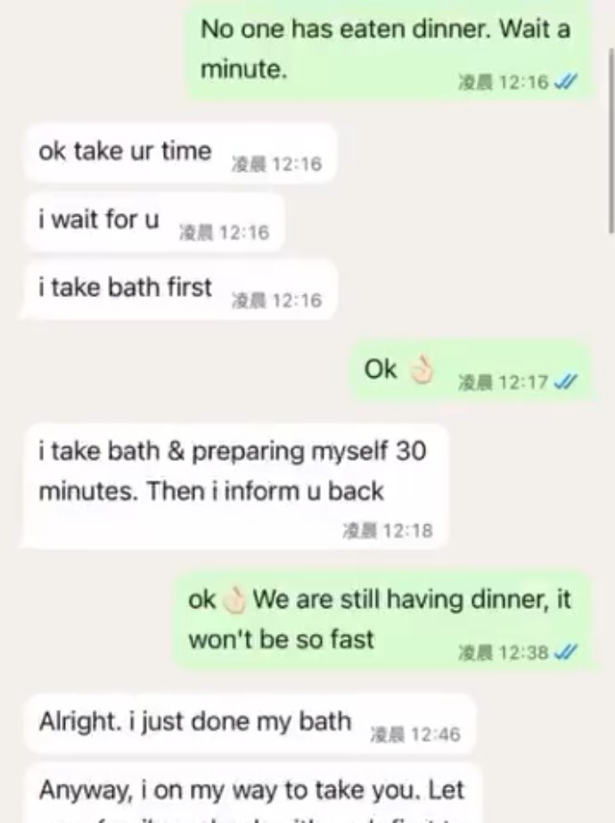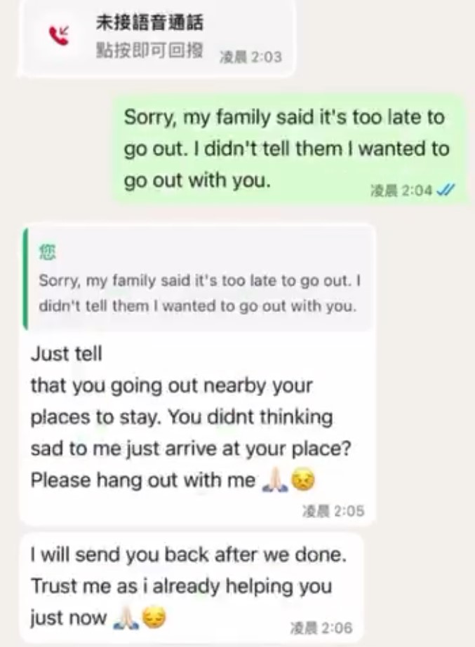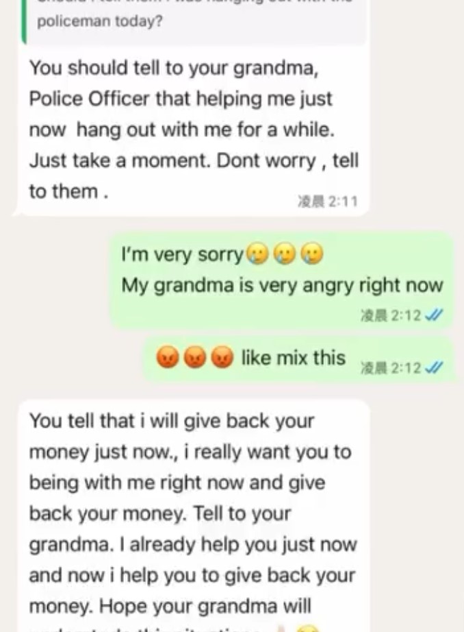 Scared, Ms Fang blocked him, took screenshots of the conversation and turned off her phone, she said.