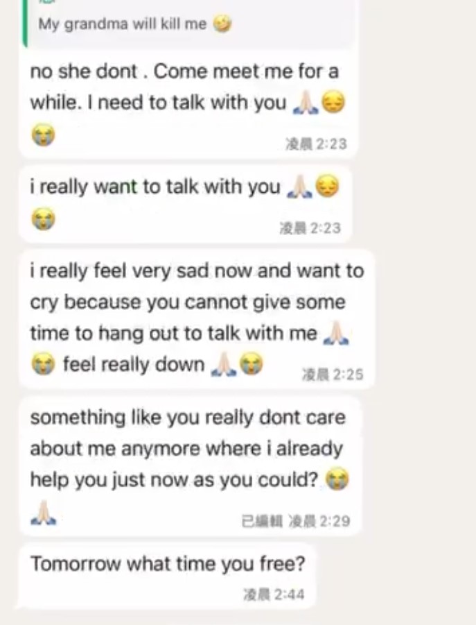From the screenshots, his messages started getting more desperate, saying he really needed her to “hang out” with him and he was “very sad” that she didn’t oblige despite him helping her earlier.