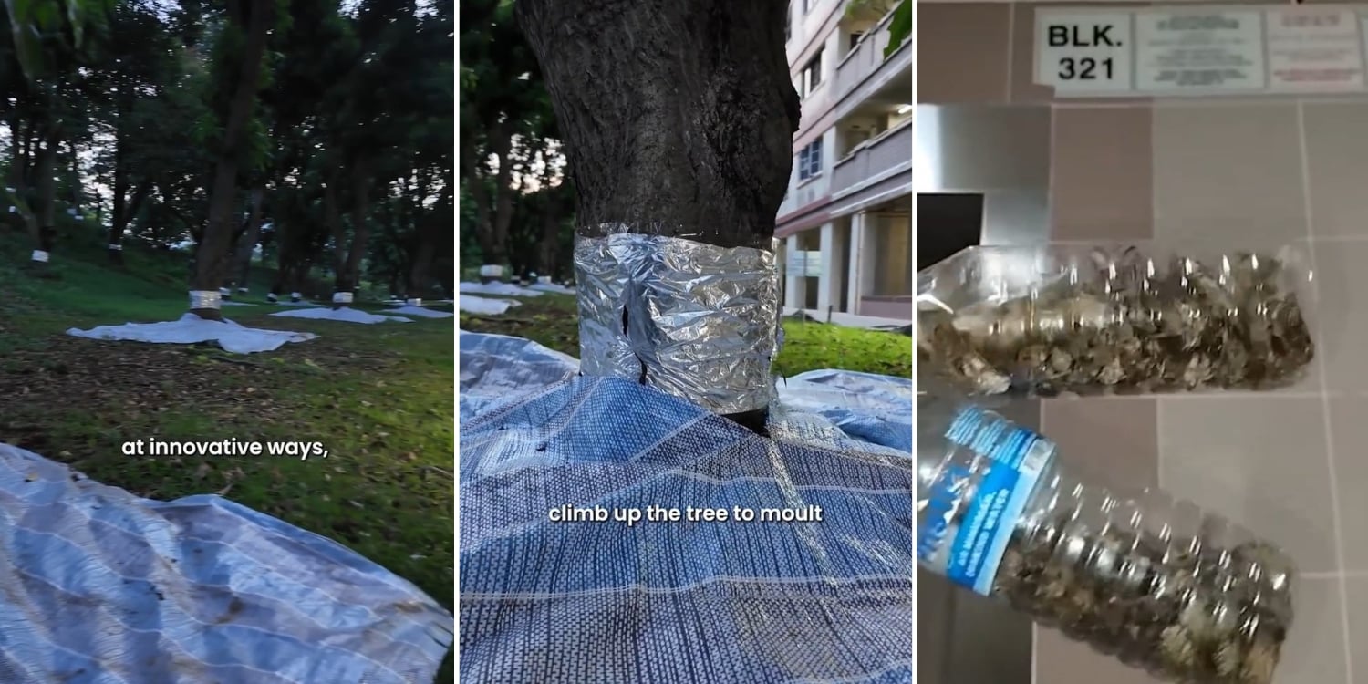 In the video, Mr Choo explained that they were tightly wrapping aluminium foil around trees to prevent cicadas from climbing up the tree to moult and lay eggs.