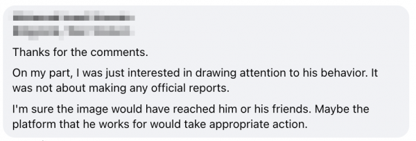 He added that he believed the images and post would likely have reached the driver or people within his social circle, and hoped that, if the driver was working for a private-hire platform, the company involved would take the appropriate action.