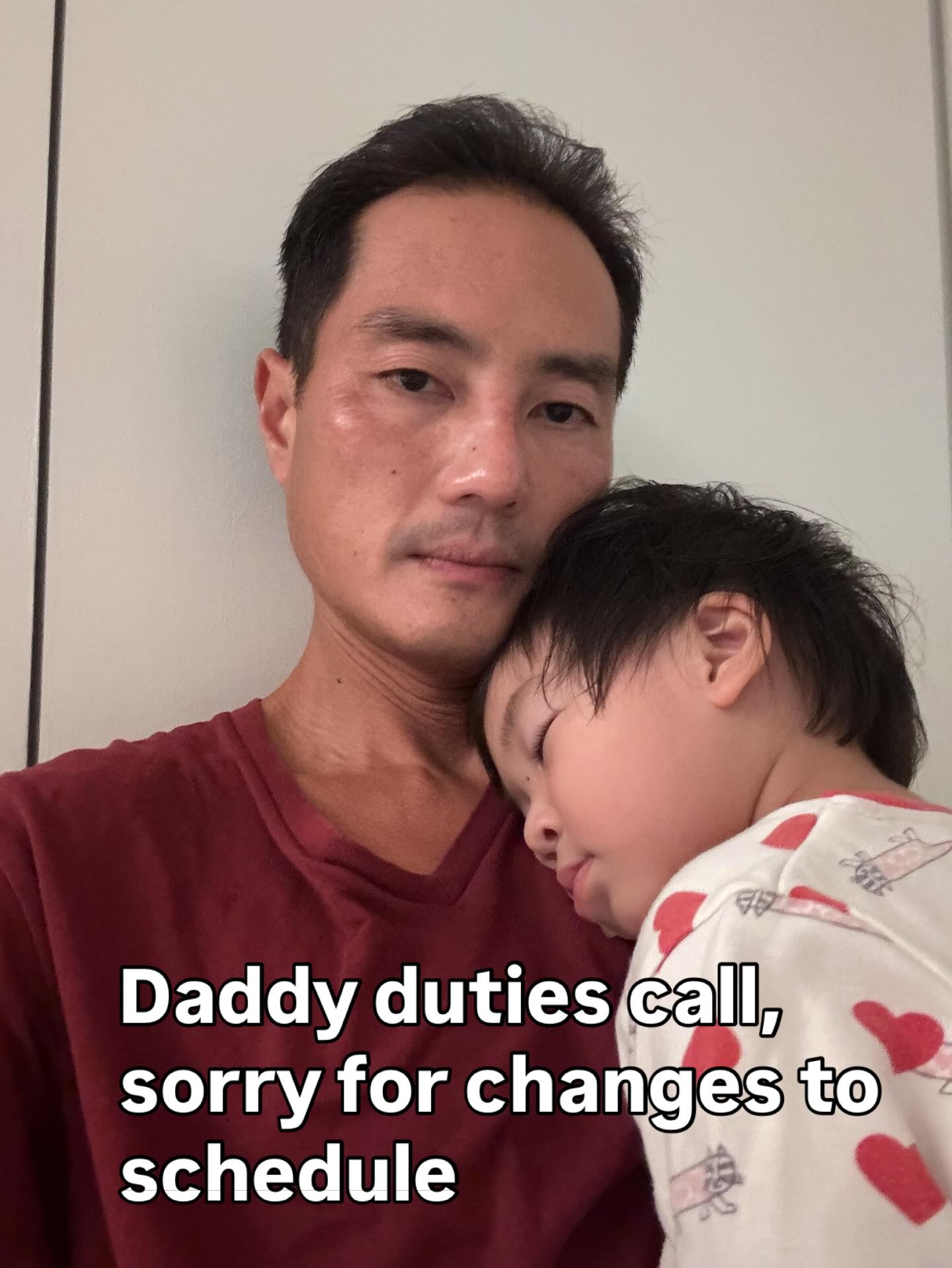 “Apologies to others for any inconvenience due to my schedule changes,” he wrote, attaching a photo of him with his daughter resting on his shoulder.