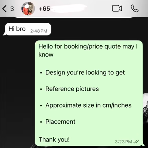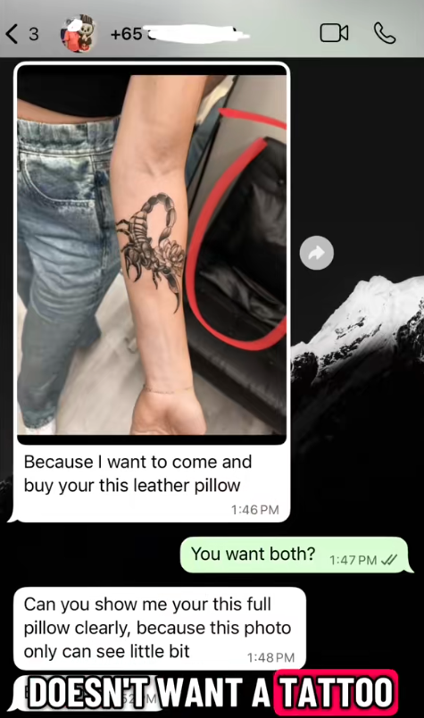 A Singapore tattoo artist was left stunned after receiving a message from someone who wasn’t enquiring about body art — but about buying the pillows used in her shop.