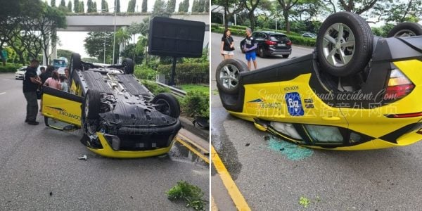 Cabby sent to hospital after taxi flips over near Marina Bay Sands, 4 passengers escape injury