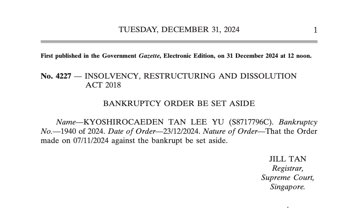 Public records show Kyoshirocaeden was officially declared bankrupt in Dec 2024.