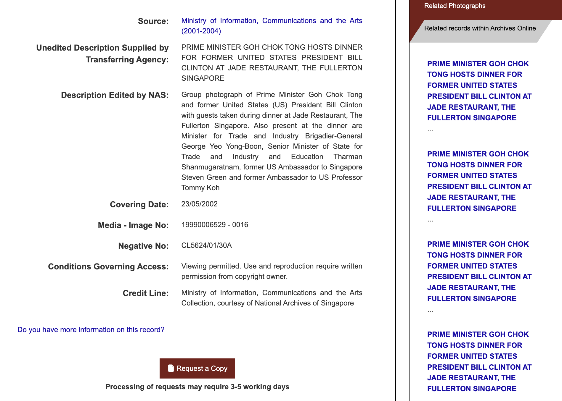 The NAS record states that the photograph was taken on 23 May 2002, during a dinner hosted by then-Prime Minister Goh Chok Tong for former United States (US) President Bill Clinton.
