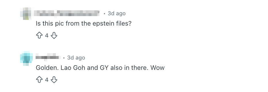 A photograph showing President Tharman Shanmugaratnam and former Prime Minister Goh Chok Tong at a group dinner with Jeffrey Epstein and Ghislaine Maxwell has resurfaced, prompting discussion on online forums.