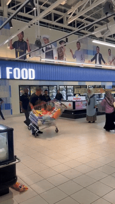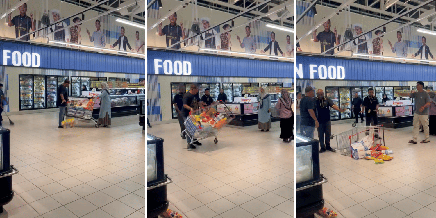 A domestic dispute over grocery shopping escalated in a Malaysian supermarket when a man overturned a shopping cart during a heated argument with his wife, scattering items across the store floor.