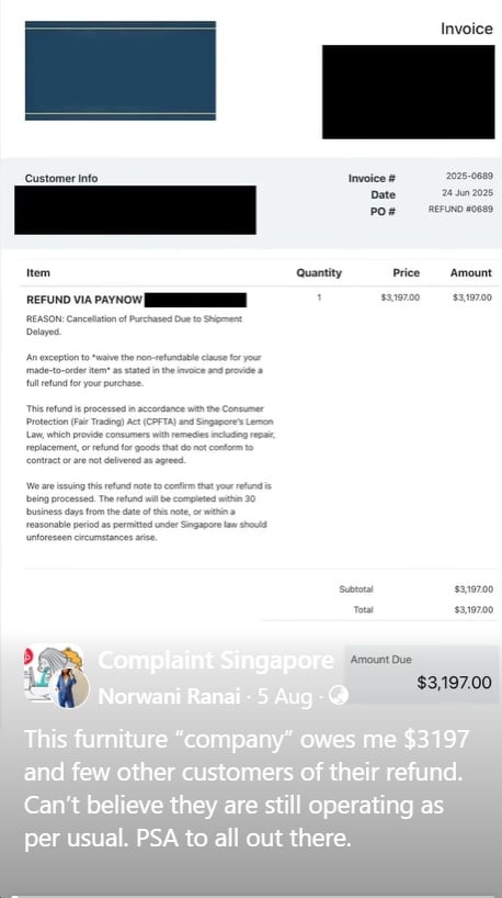 The company, which has been identified as The Simple Furniture, caused their customers to lose more than S$40,000.