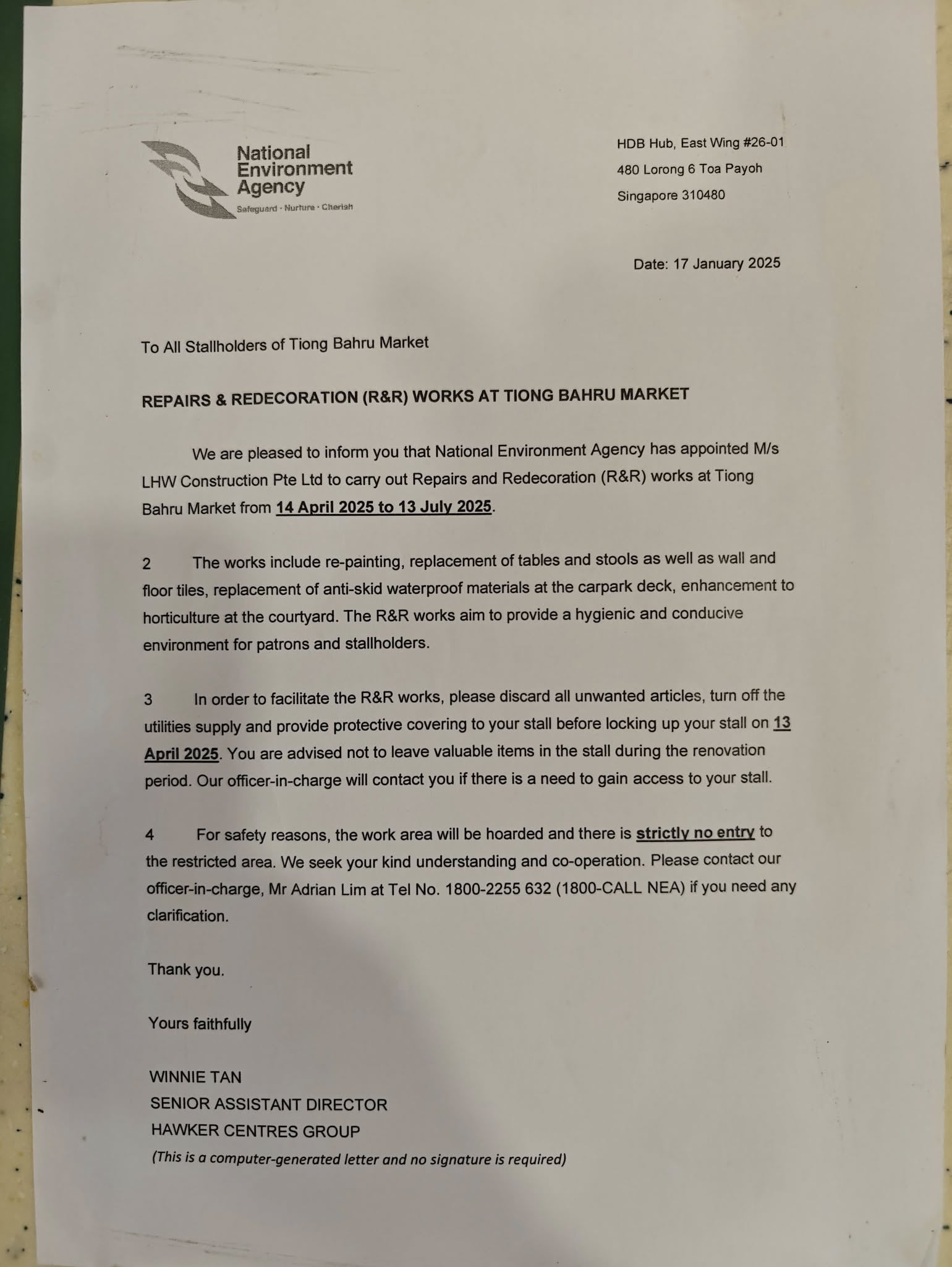 It said the National Environment Agency (NEA) had already appointed a contractor to carry out “Repairs and Redecoration” (R&R) works during the indicated period.