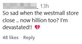 An Instagram user said they were devastated by the news of the Hillion Mall outlet closure.