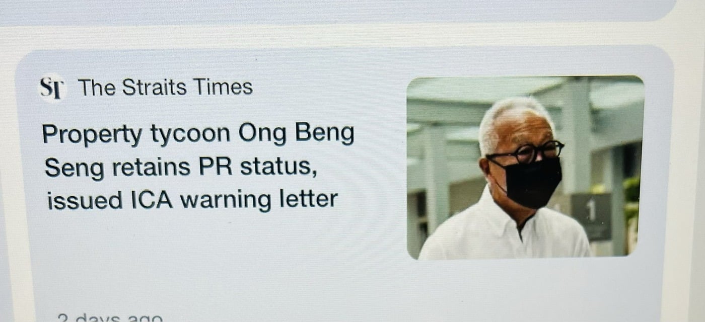 Attached to the post was a screenshot of a The Straits Times (ST) article titled “Property tycoon Ong Beng Seng retains PR status, issued ICA warning letter“.