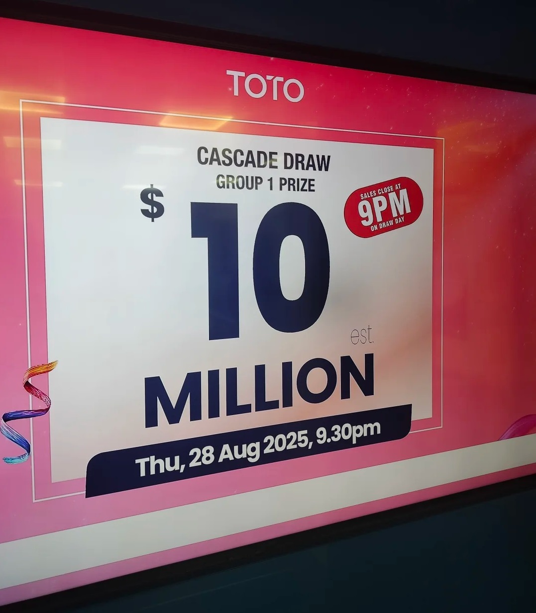A 10th TOTO cascade draw of 2025 is looming after the jackpot again swelled to an estimated S$10 million, this time for the draw on Monday (29 Sept).