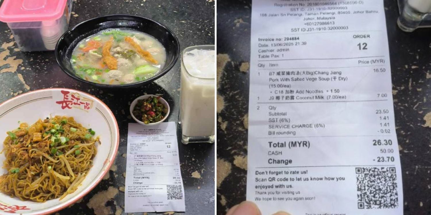 The post also included photos of her meal and a receipt showing her order — a bowl of pork noodle soup and coconut milk, which cost RM26.30 (S$7.93).