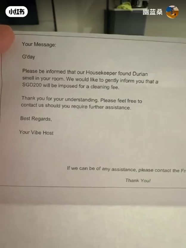 A photo of the note read: “Please be informed that our Housekeeper found Durian smell in your room… SG200 will be imposed for a cleaning fee.”