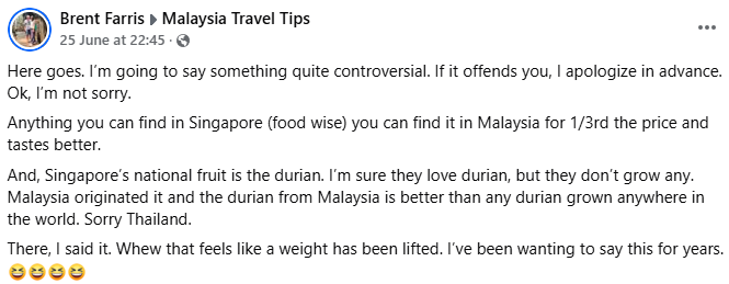 Posting in the Malaysia Travel Tips Facebook group on 25 June, Brent Farris claimed that Malaysia offers the same variety of food as Singapore, but at just “1/3rd the price” — and in his opinion, it “tastes better”.