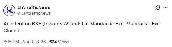 In a post on X, the LTA said at 8.15pm that the accident had occurred along the BKE in the direction of Woodlands, at the exit to Mandai Road.