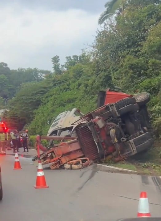 A video posted by @sgfollowsall on Instagram showed the truck, which was carrying a heavy vehicle, lying on a grass verge at the side of the expressway.