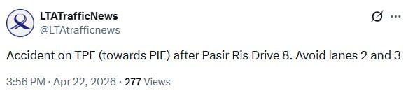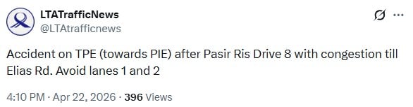 In a post on X, the Land Transport Authority (LTA) said at 3.56pm on 22 April that the accident had occurred in the direction of the Pan-Island Expressway (PIE), after the Pasir Ris Drive 8 exit.