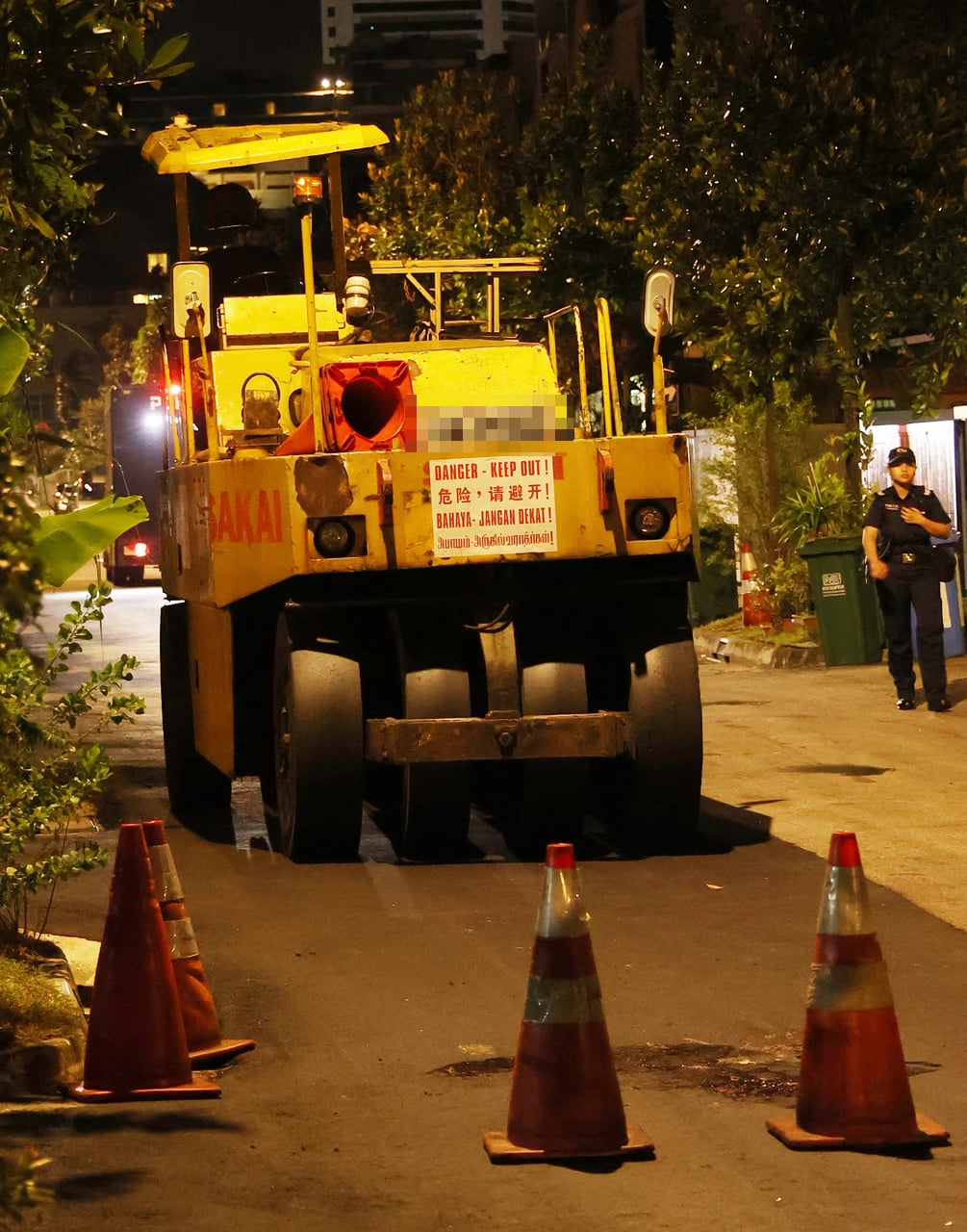 A photo shared by SG Road Vigilante showed a blue police tent in front of a large yellow road roller, with workers in hard hats and high-visibility vests watching from the roadside.