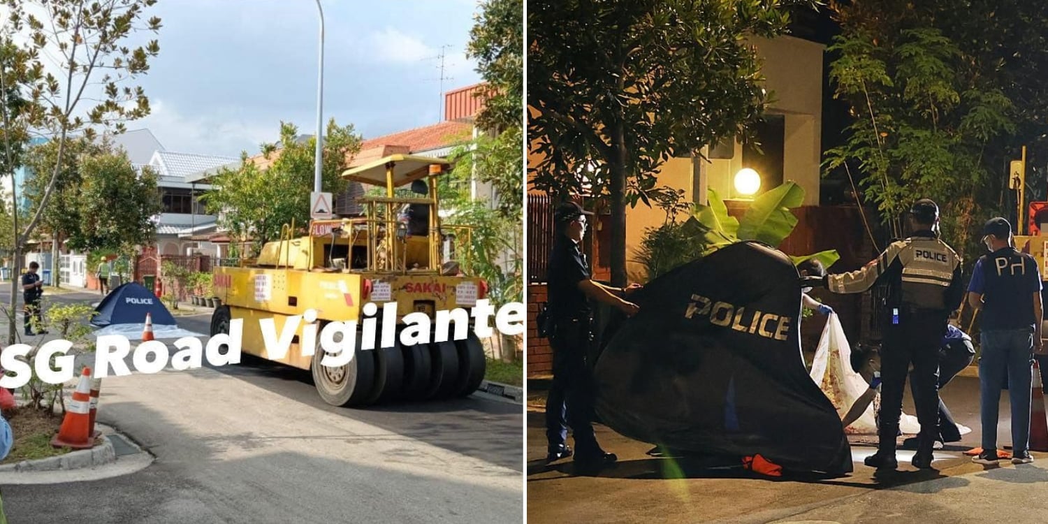 A photo shared by SG Road Vigilante showed a blue police tent in front of a large yellow road roller, with workers in hard hats and high-visibility vests watching from the roadside.