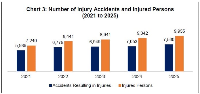 The number of people injured in traffic accidents also jumped by 6.6% to 9,955 in 2025. The number of traffic accidents that led to injuries rose by a greater percentage of 7.2% to 7,560.