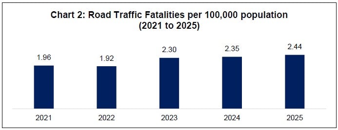 The fatality rate from traffic accidents per 100,000 population also increased to 2.44 in 2025, up from 2.35 in 2024.