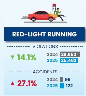 Seven people died from accidents related to red-light running, one more than in 2024.