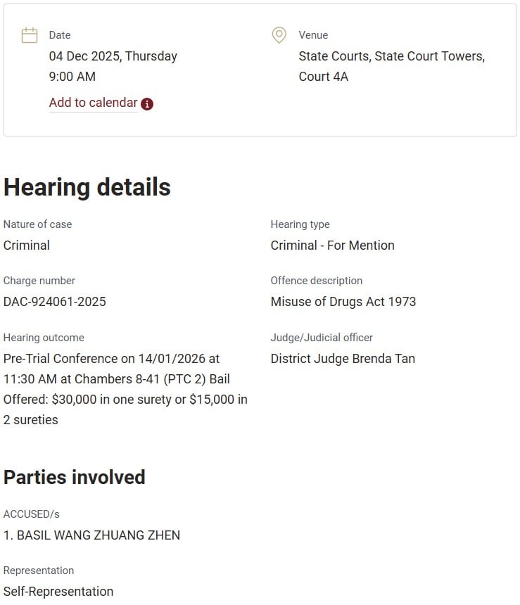 He appeared at the State Courts at 9am, according to information posted on the SG Courts website.
