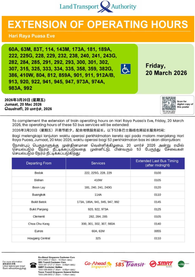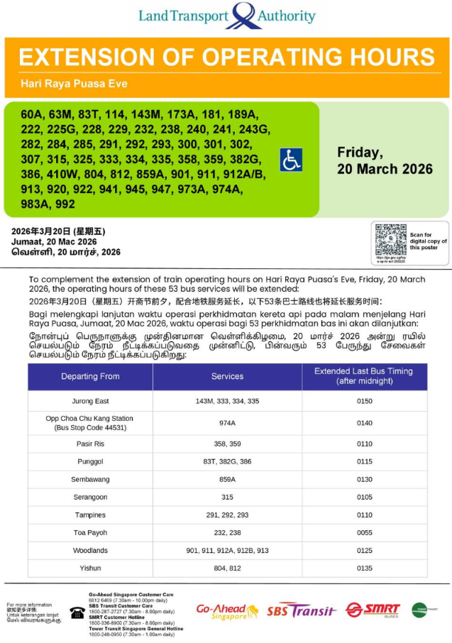 Meanwhile, SBS Transit will extend its services on the North East Line, Downtown Line, and Sengkang-Punggol LRT by about half an hour on 20 March.