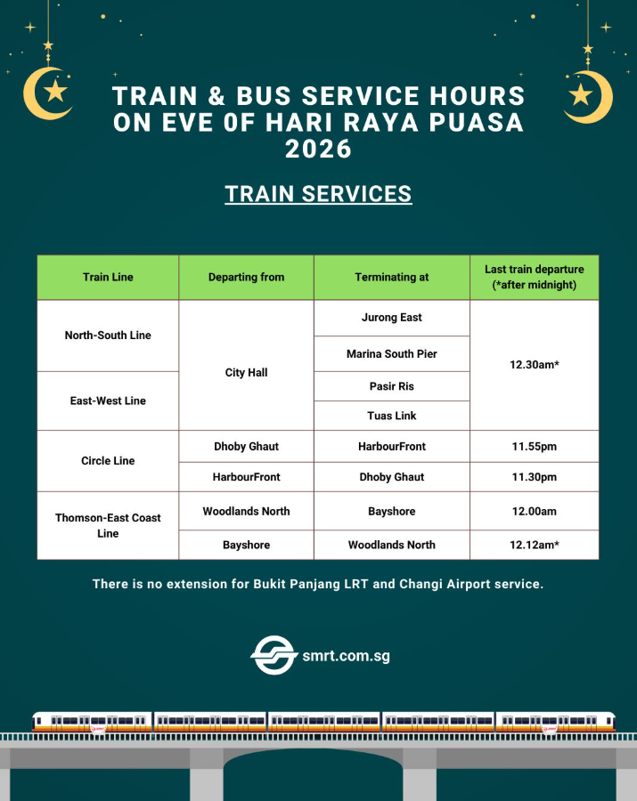 SMRT made the announcement on Friday (6 March), sharing the extended timings for both train services and bus timings.