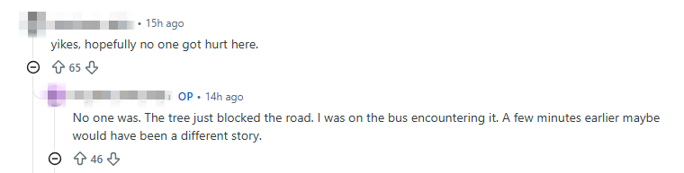 The NUS spokesperson clarified that a tree branch had snapped and fallen across Kent Ridge Crescent.