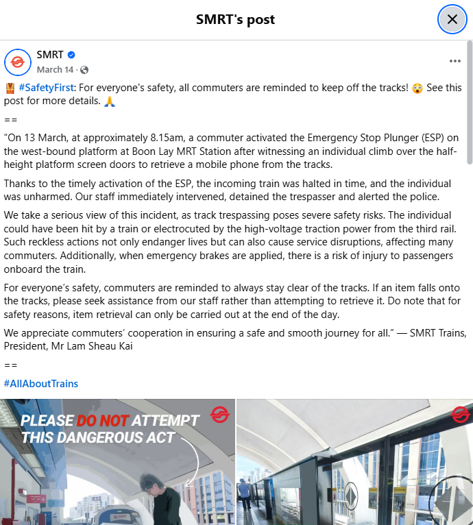 Also read: Man climbs over platform screen doors at Boon Lay MRT to retrieve phone, detained by SMRT staff