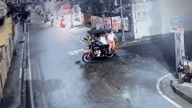 CCTV footage of the incident, shared on Facebook, shows the tricycle driver trying to restart the vehicle, which had stalled in the middle of the road, when it unexpectedly ignited.