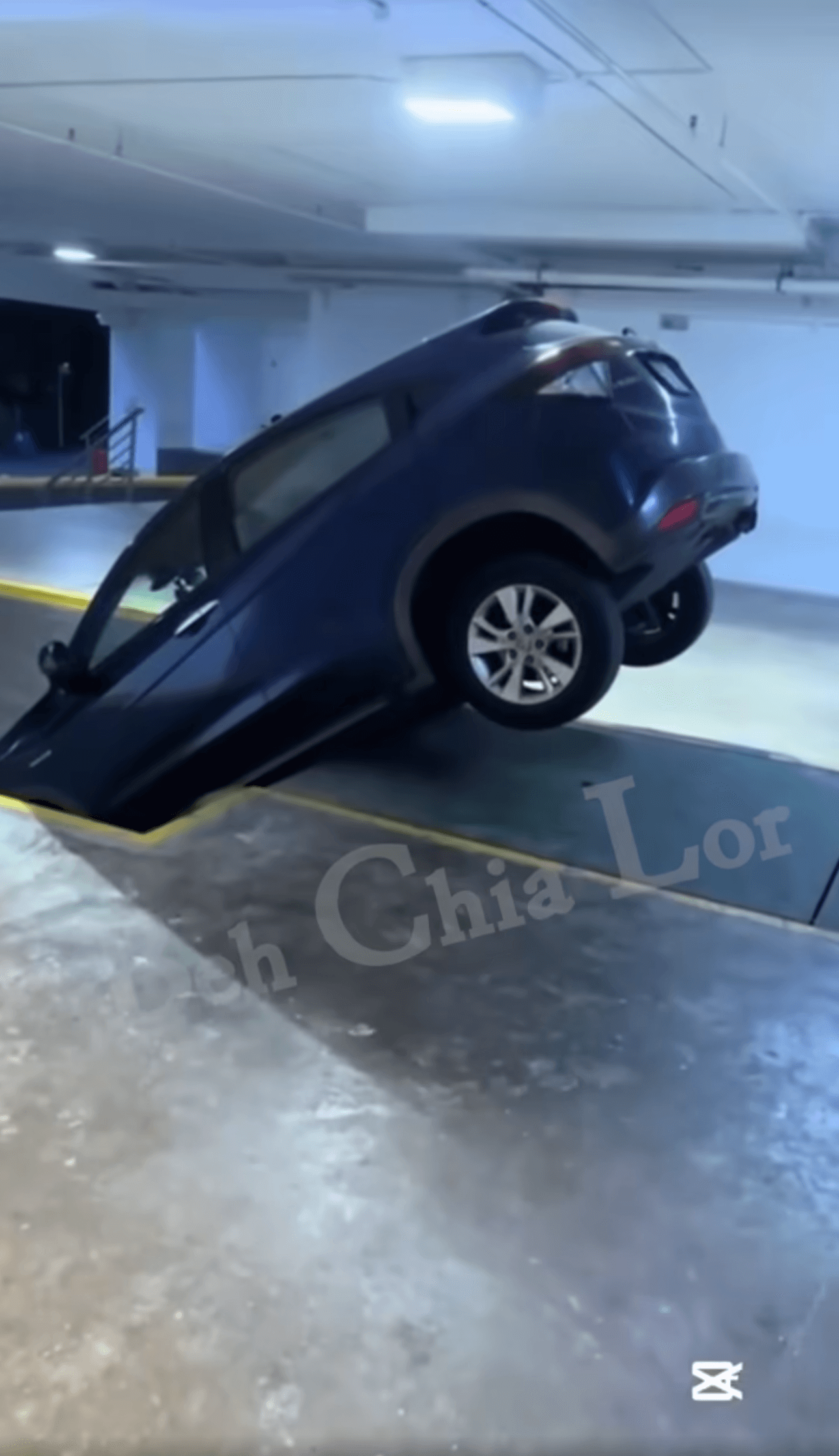 Footage shared on the ‘Beh Chia Lor – Singapore Road’ Facebook page on 13 May shows a blue car lodged nose-down in the loading bay, believed to have driven straight off the edge after mistaking it for a slope.