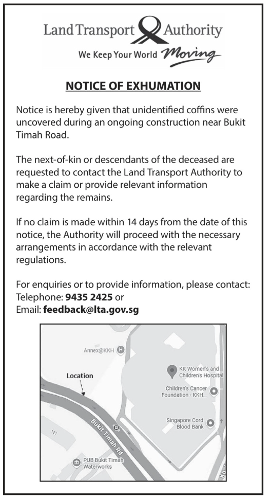 The Land Transport Authority (LTA) issued a notice in The Straits Times (ST) classified section on Wednesday (3 Dec), appealing for next-of-kin or descendants to come forward.