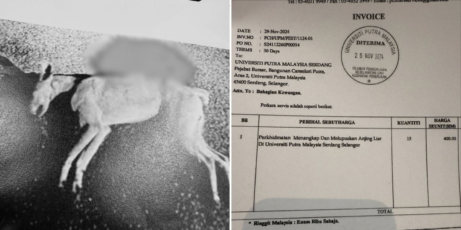 The organisation also presented an invoice from the private company stating that the university ordered the “capture and removal” of 15 dogs at a rate of RM400 (S$120) per animal.