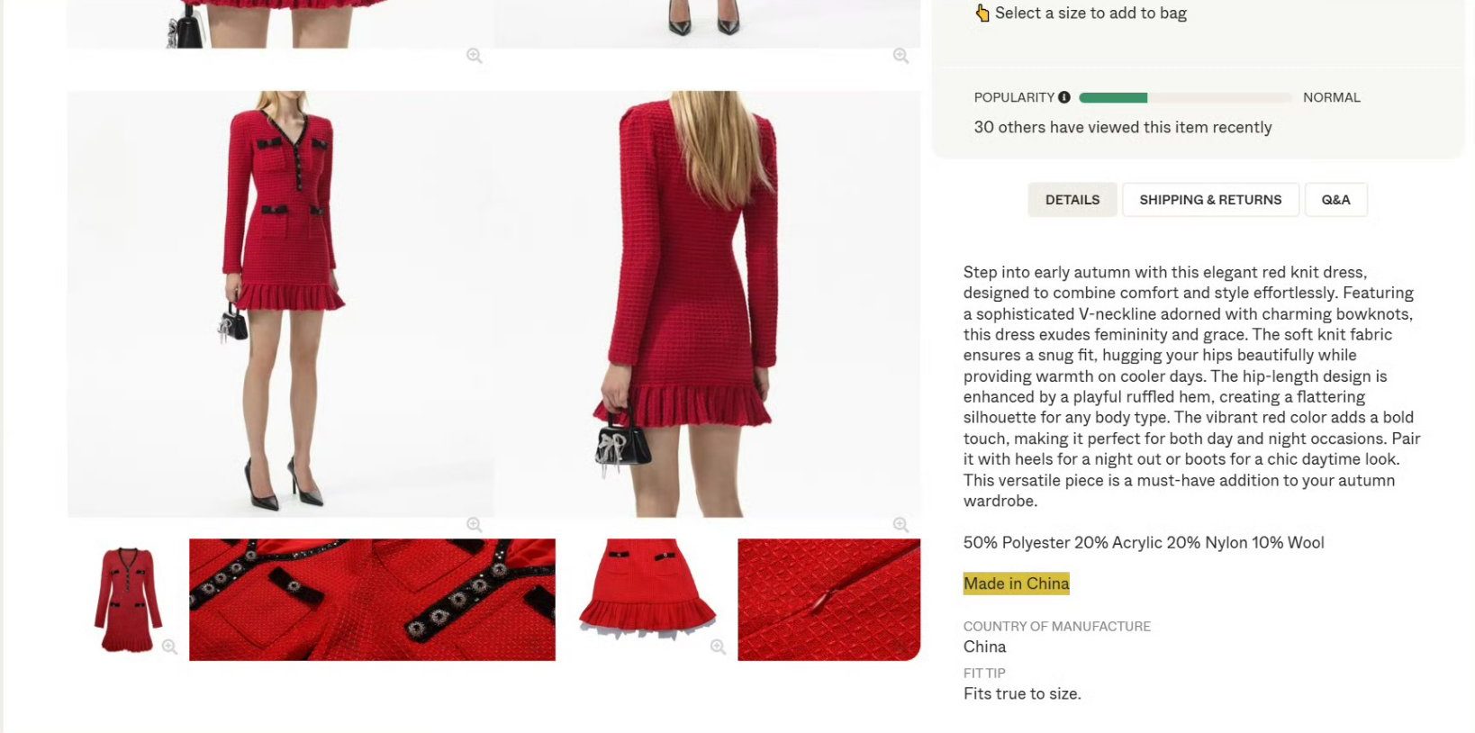 The Chinese diplomat later shared a Douyin post of a screen capture of a retailer’s website depicting the dress and clearly stating it was “Made in China”.
