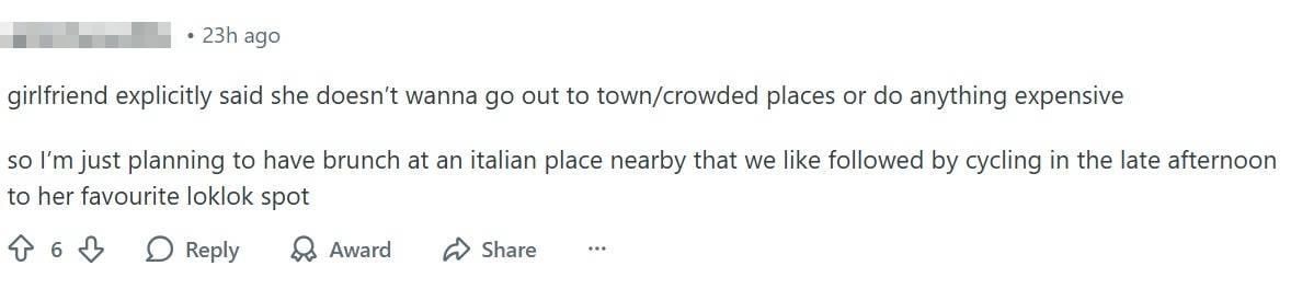 One Redditor said they planned to have brunch nearby before cycling to their girlfriend’s favourite dinner spot in the afternoon.