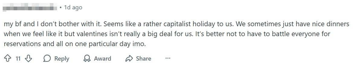 Another netizen mentioned they don’t celebrate Valentine’s Day at all, calling it “a rather capitalist holiday”.