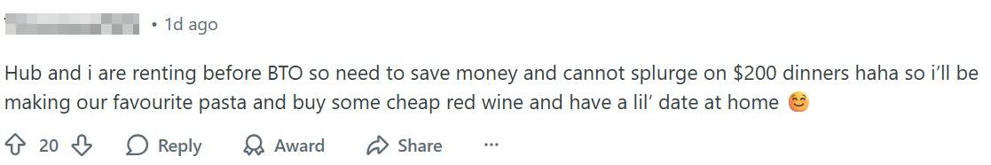 “Partner and me decided for a simple year with no expensive dinner dates or huge expense throughout the occasions as we are saving for our renovation for our upcoming BTO,” the OP wrote.
