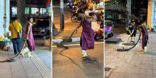 Man in Thailand grabs giant snake with bare hands, drags it through road like a toy