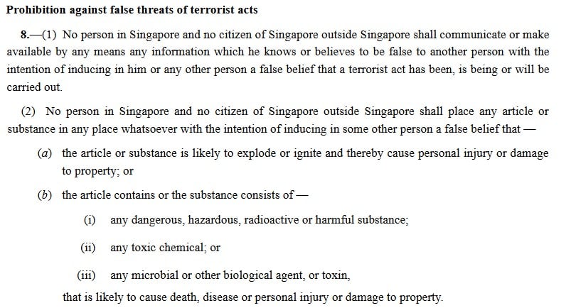According to Singapore Statutes Online, the regulation states that no person in Singapore shall place any article in any place with the intention of “inducing… a false belief” that it is like to “explode or ignite” and cause injury or damage.